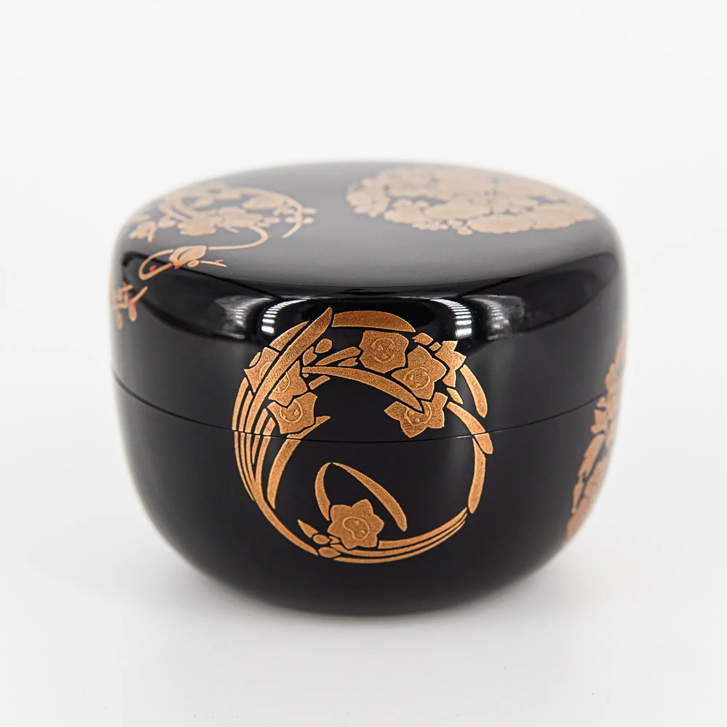 This black lacquer hira-natsume features exquisite gold maki-e Hanamaru (floral crest) motifs, each side decorated with a seasonal flower. Traditionally used for usucha (thin tea), it pairs refined functionality with timeless artistry.