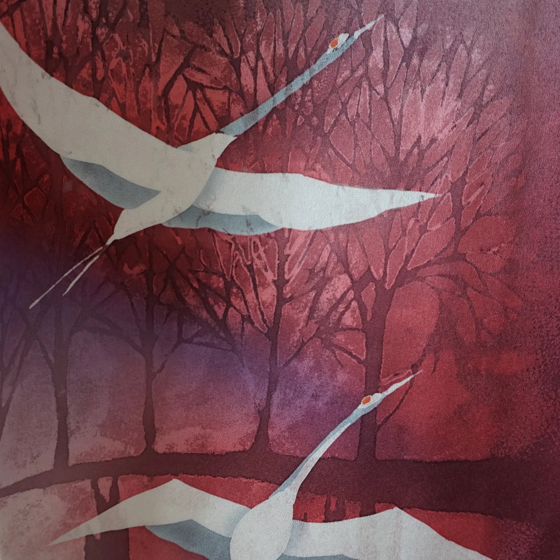 A graceful vintage silk Hōmongi in a warm rust red, featuring white cranes (tsuru) soaring above a forest scene. Executed in refined Yūzen dyeing on soft silk and fully lined (awase). A timeless piece that blends traditional craftsmanship with elegant, modern wearability.